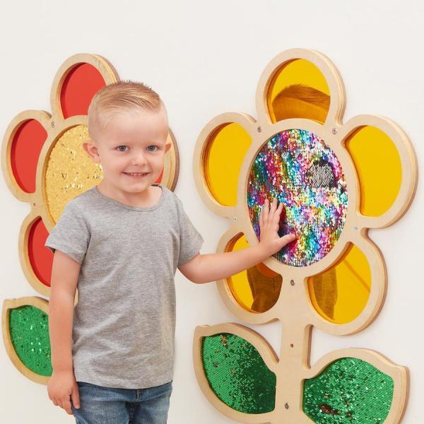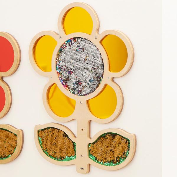 I bambini si sentiranno attratti da questi fiori tattili mentre sperimentano la superficie accattivante e guardano nei petali dello specchio per vederne il riflesso. Decorare l'ambiente sostenendo importanti capacità motorie e il senso di scoperta e curiosità dei bambini. Stendere sulle paillettes e rivelare un colore diverso.