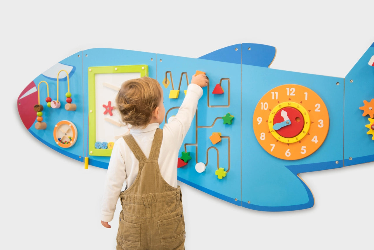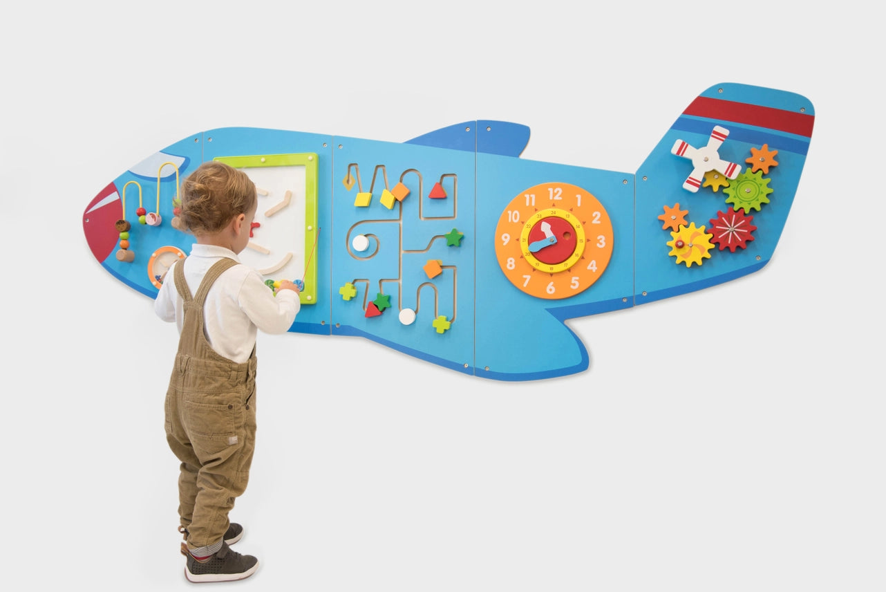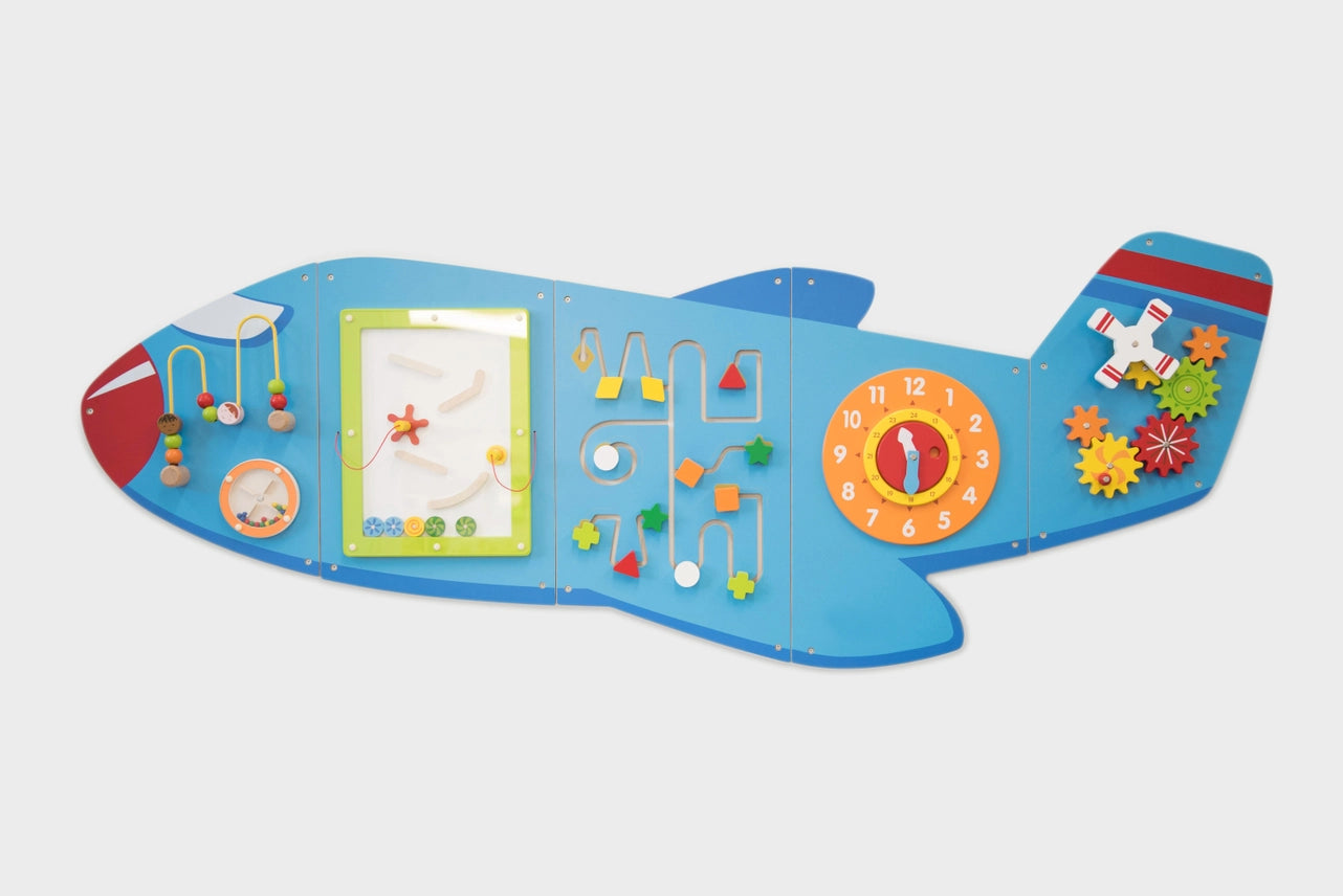 Giocattolo da parete in legno in cinque sezioni, ognuna con una serie diversa di attività manipolative per incoraggiare la coordinazione occhio-mano e le capacità motorie fini, tra cui un orologio con lancette mobili, labirinto di perline metalliche, penne magnetiche, labirinto di forme e ingranaggi ad incastro. Ideali per il gioco individuale o collaborativo, le sfide offrono ai bambini una serie di opportunità di apprendimento pratico, tra cui la risoluzione dei problemi e lo sviluppo del linguaggio. L'aeroplano è composto da 5 pannelli con fori di fissaggio e viti di fissaggio per un facile montaggio a parete. Realizzato in MDF e consigliato solo per uso interno.