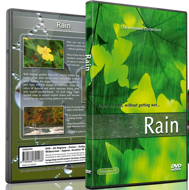 Ogni film può essere goduto con una scelta di sei diverse tracce audio: suoni autentici della pioggia o musica rilassante, consentendoti di personalizzare la tua esperienza visiva.