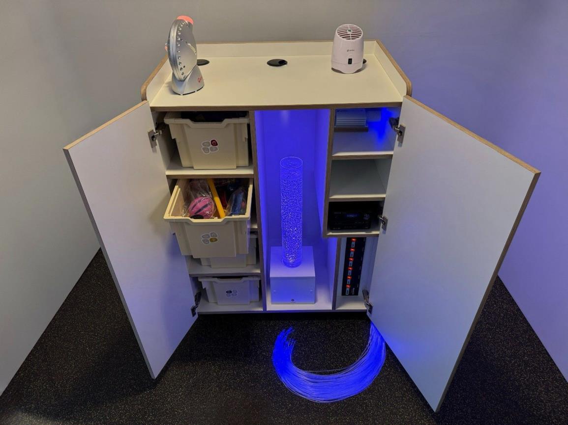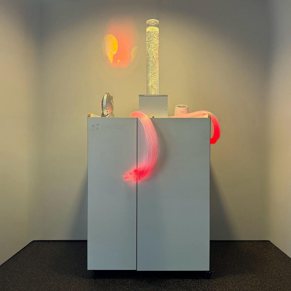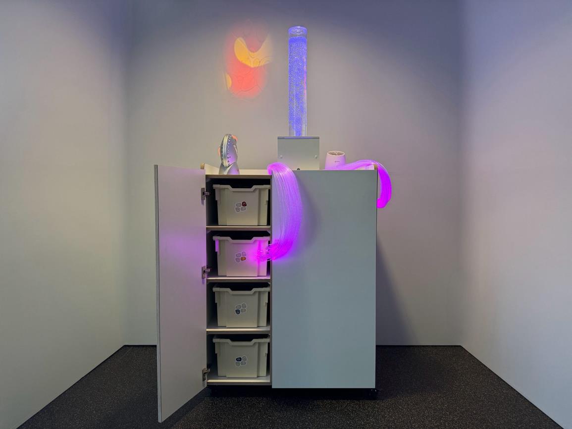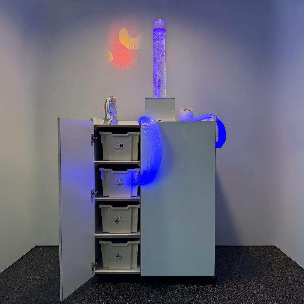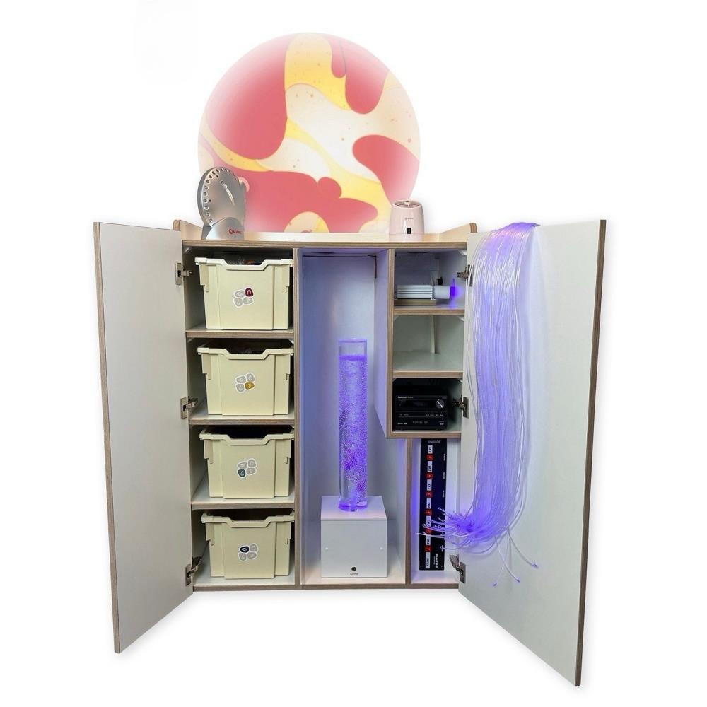 I materiali sensoriali sono ordinatamente organizzati per senso (vista, udito, tatto e olfatto), aggiungendo una dimensione extra all'esperienza. Tutti i componenti elettrici sono pre-collegati: basta collegarli e la sessione di snoezelen può iniziare immediatamente.