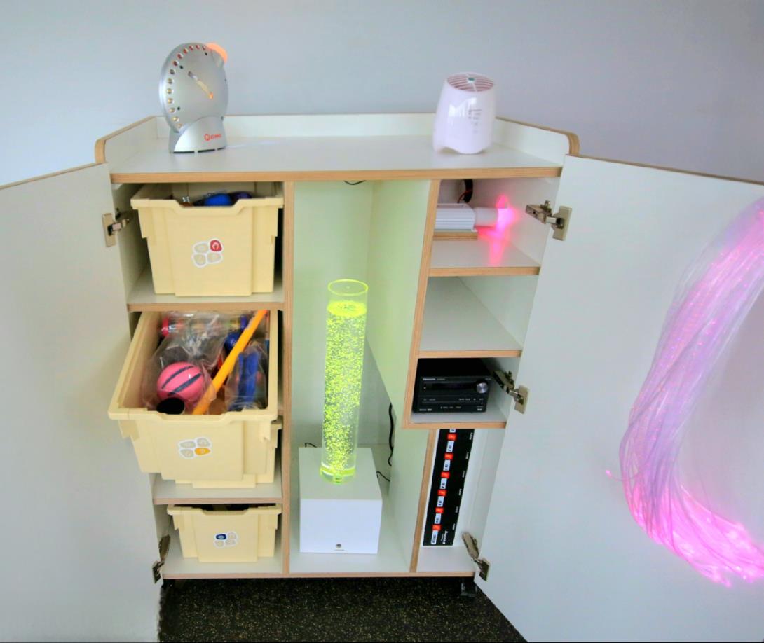 Il carrello snoezelen mobile, completo e compatto, è appositamente progettato per le persone con disabilità e include tutto il necessario per iniziare subito a fare snoezelen.