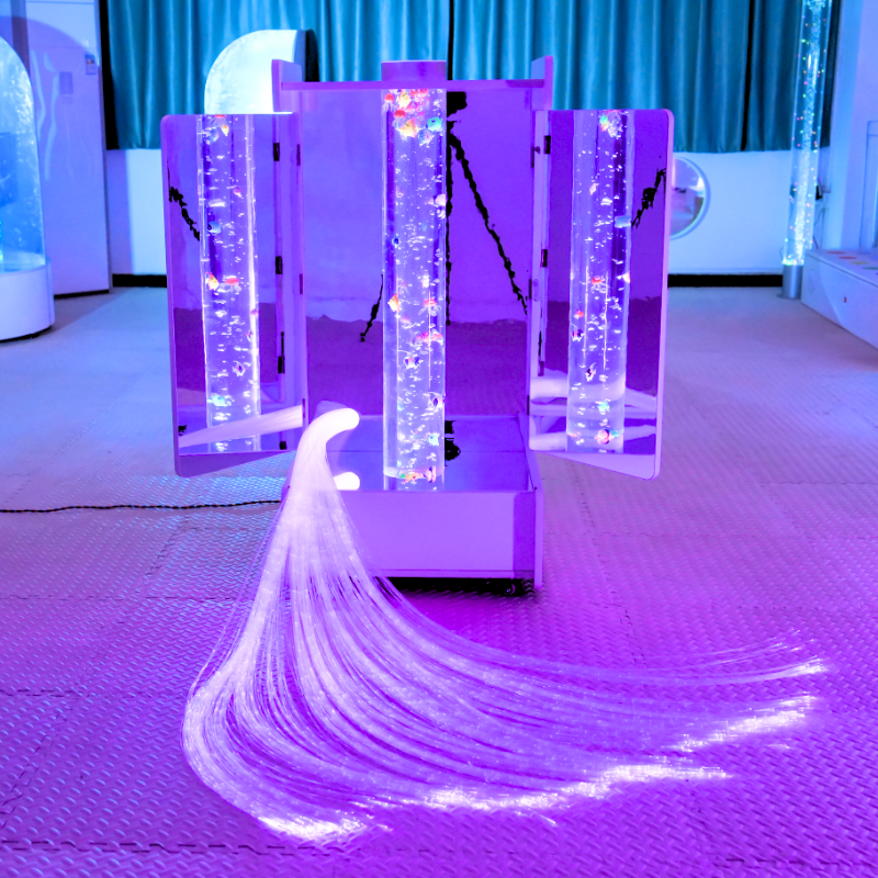 La nostra piccola postazione mobile è dotata di un tubo a bolle 120x15 cm, sorgente luminosa da 16w con fibre ottiche 100 code x 150 cm, proiettore LED con 1 disco ad olio, set video con mini proiettore a focale corta, proiettore laser di stelle e galassia, diffusore professionale di aromi, armadietti posteriori dove posizionare i set sensoriali inclusi nella postazione: