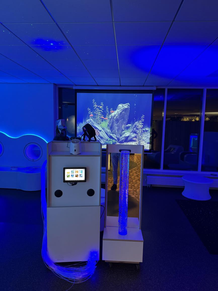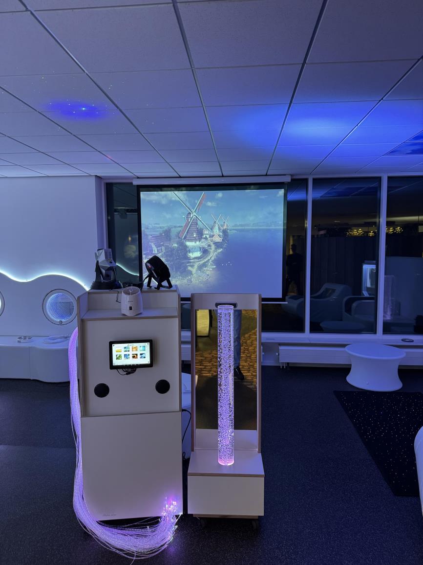 Il carrello è dotato di un PC touchscreen, un proiettore e un controller Bluetooth per un facile utilizzo di periferiche come i prodotti Interactive. L'unità a bolla è dotata di un resistente pannello posteriore a specchio, che esalta gli effetti di luce. Il mobile è mobile, ha ante con serratura e include un sistema di gestione dell'alimentazione per un comodo controllo di tutte le apparecchiature.