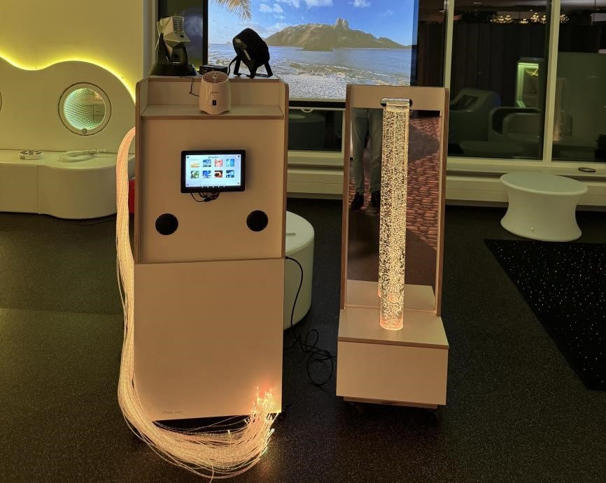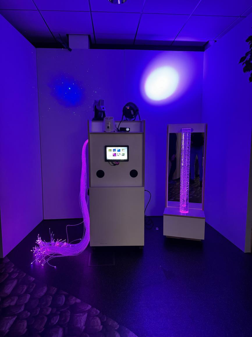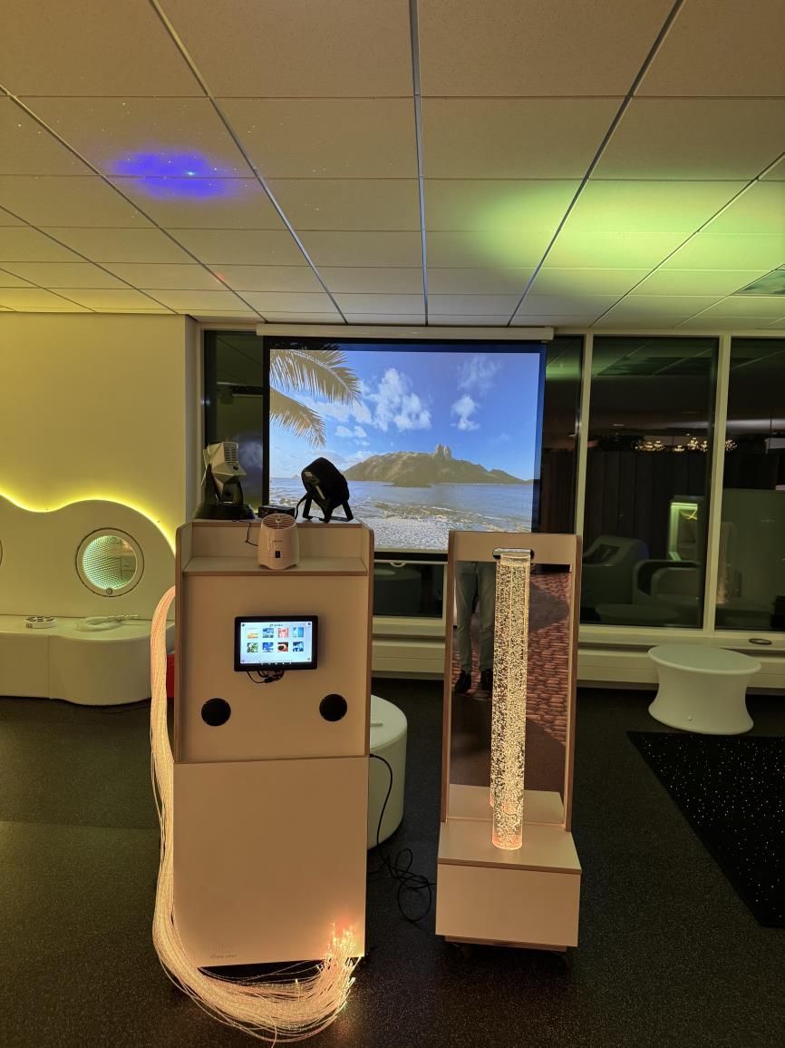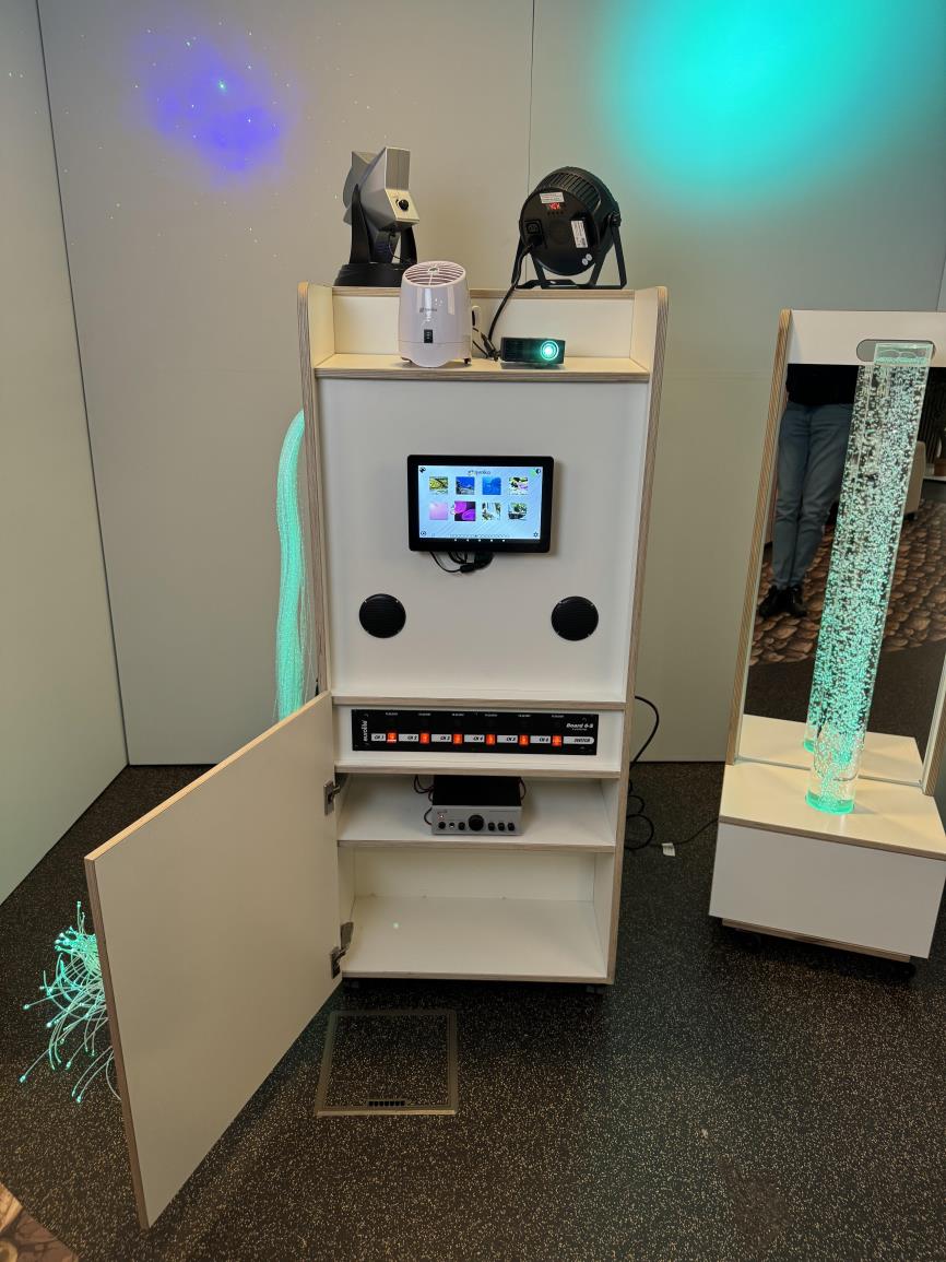 Postazione mobile sensoriale bianca con sistema sensoriale Interactive, offre un'esperienza unica e interattiva in qualsiasi stanza sensoriale, soggiorno, camera da letto o spazio multifunzionale. Con un solo tocco, il sistema integrato crea un'atmosfera completa in cui immagini, suoni e colori si fondono per un'esperienza rilassante o stimolante.