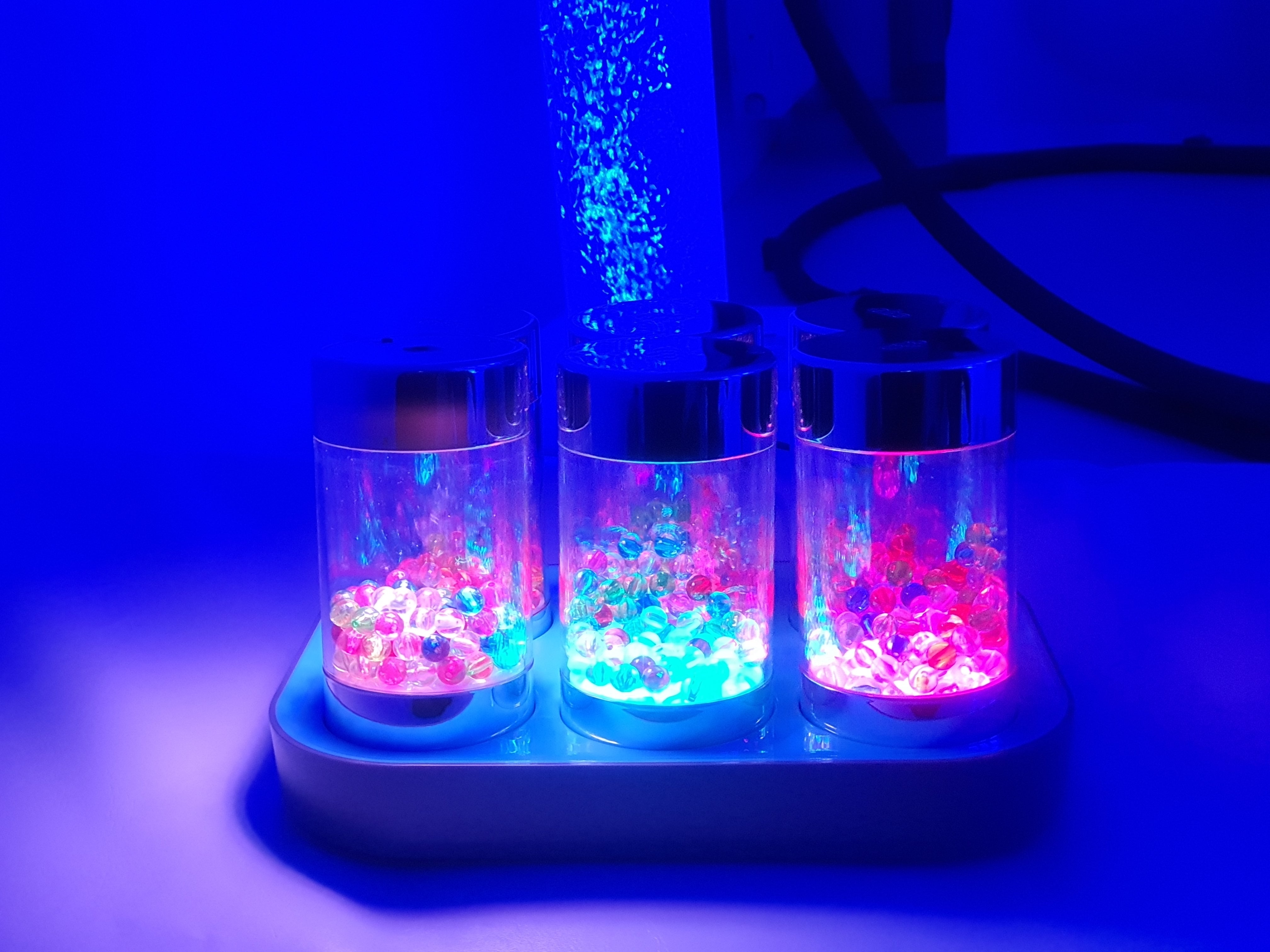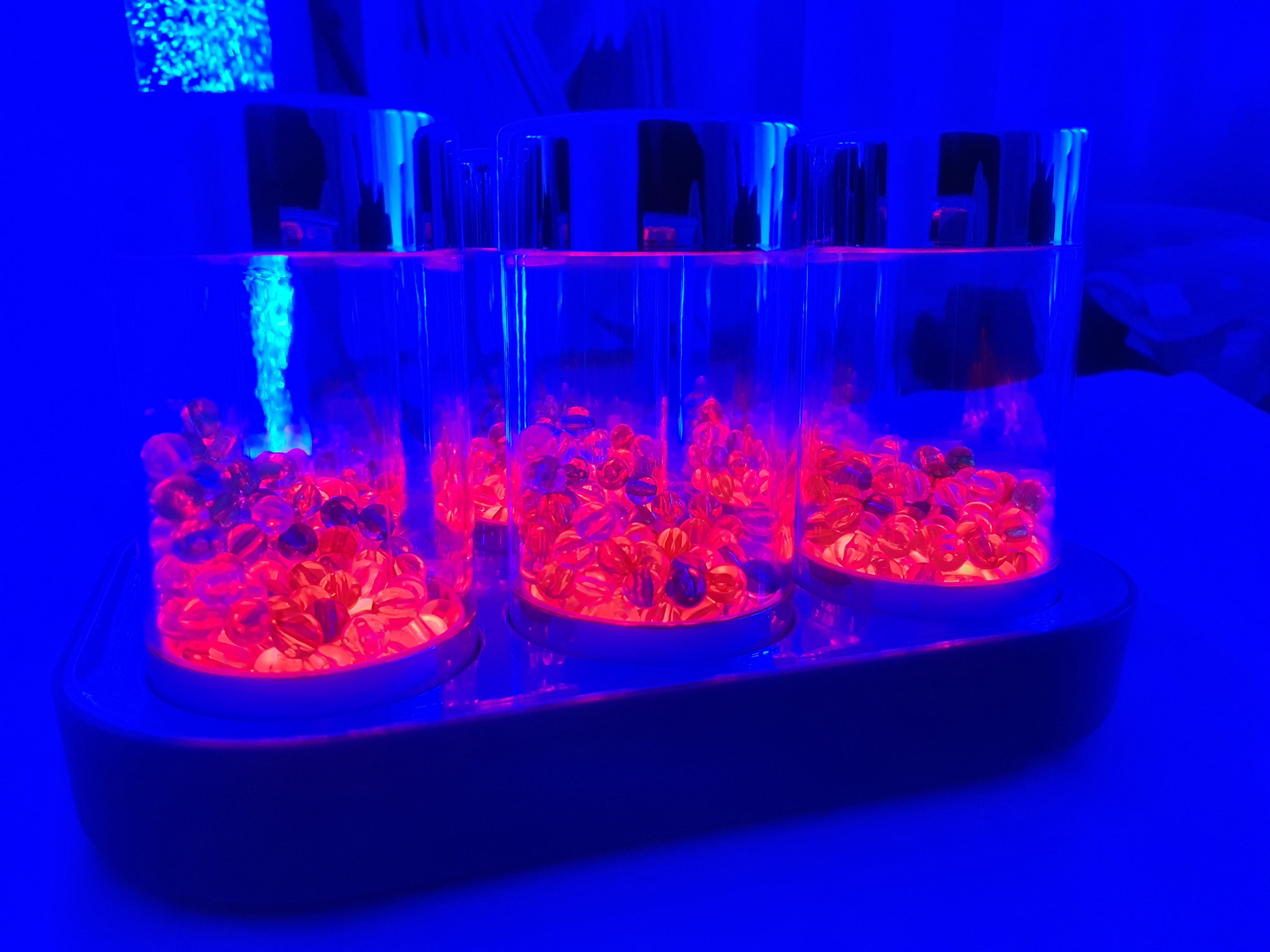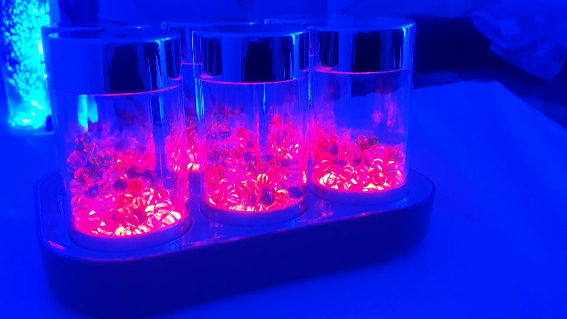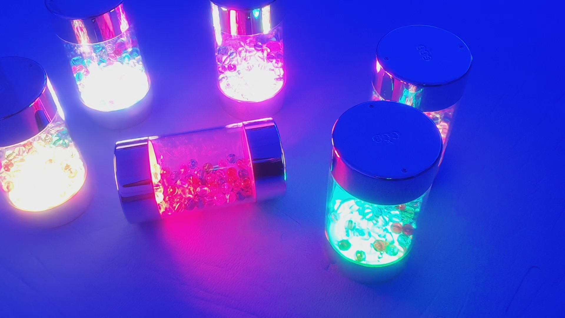 Un attraente set di sei cilindri in metallo con contenuto illuminato per rotolare, agitare, impilare e girare.