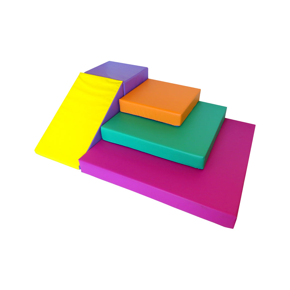 Il set supporta lo sviluppo della coordinazione motoria, favorisce l’esplorazione dello spazio e del colore: rampette, superfici molli, spazi da salire/scendere, dove il bambino può muoversi in sicurezza, conoscere il proprio corpo e il rapporto con volumi e superfici.