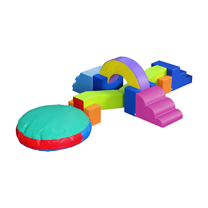 Il set supporta lo sviluppo della coordinazione motoria, favorisce l’esplorazione dello spazio e del colore: rampette, superfici molli, spazi da salire/scendere, dove il bambino può muoversi in sicurezza, conoscere il proprio corpo e il rapporto con volumi e superfici.