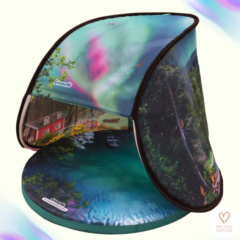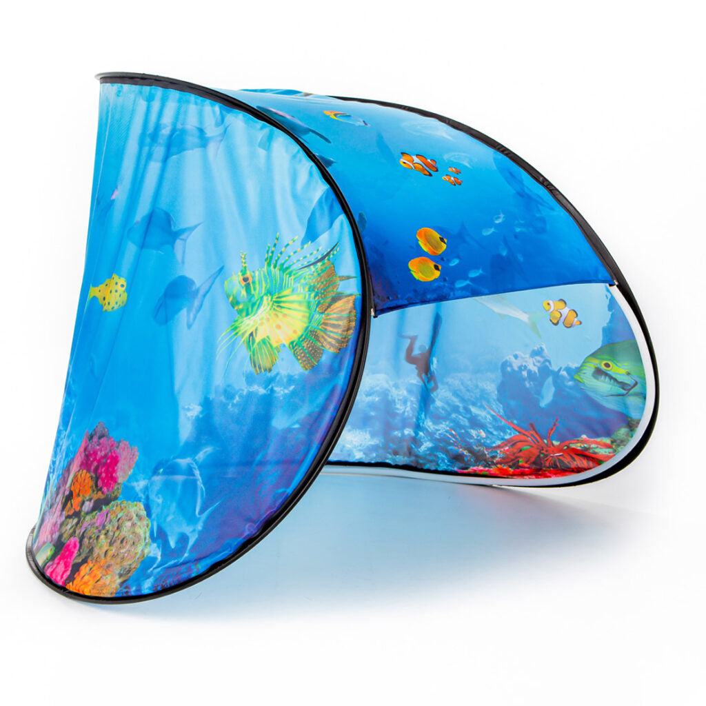 La tenda Snoezelen comprende un modulo controllo suono/luci con 5 diverse scene: sott'acqua, foresta, mare, spazio, nordico. Ci sono 2 scene luminose e sonore per ogni tema: modalità intensa e calma.